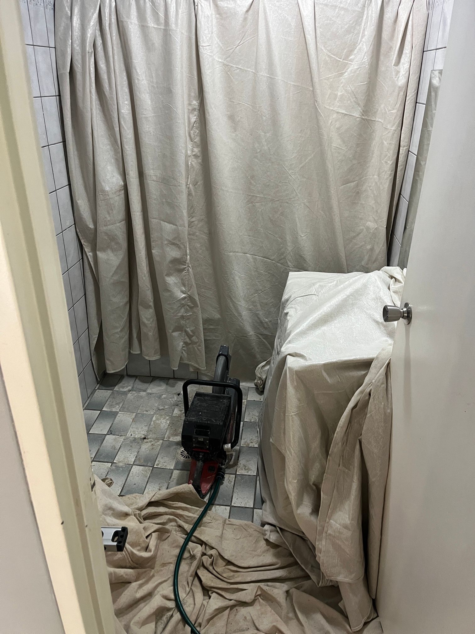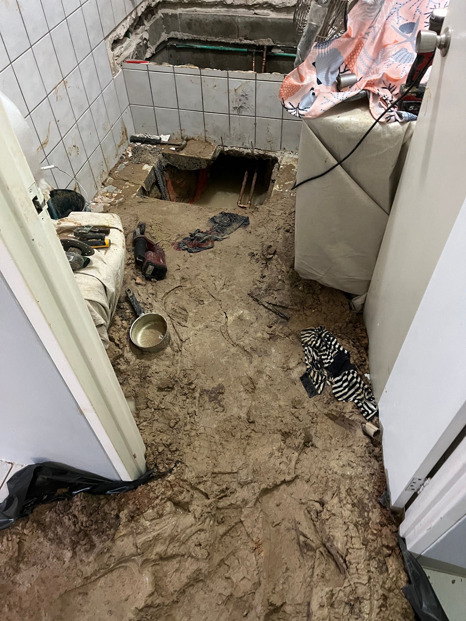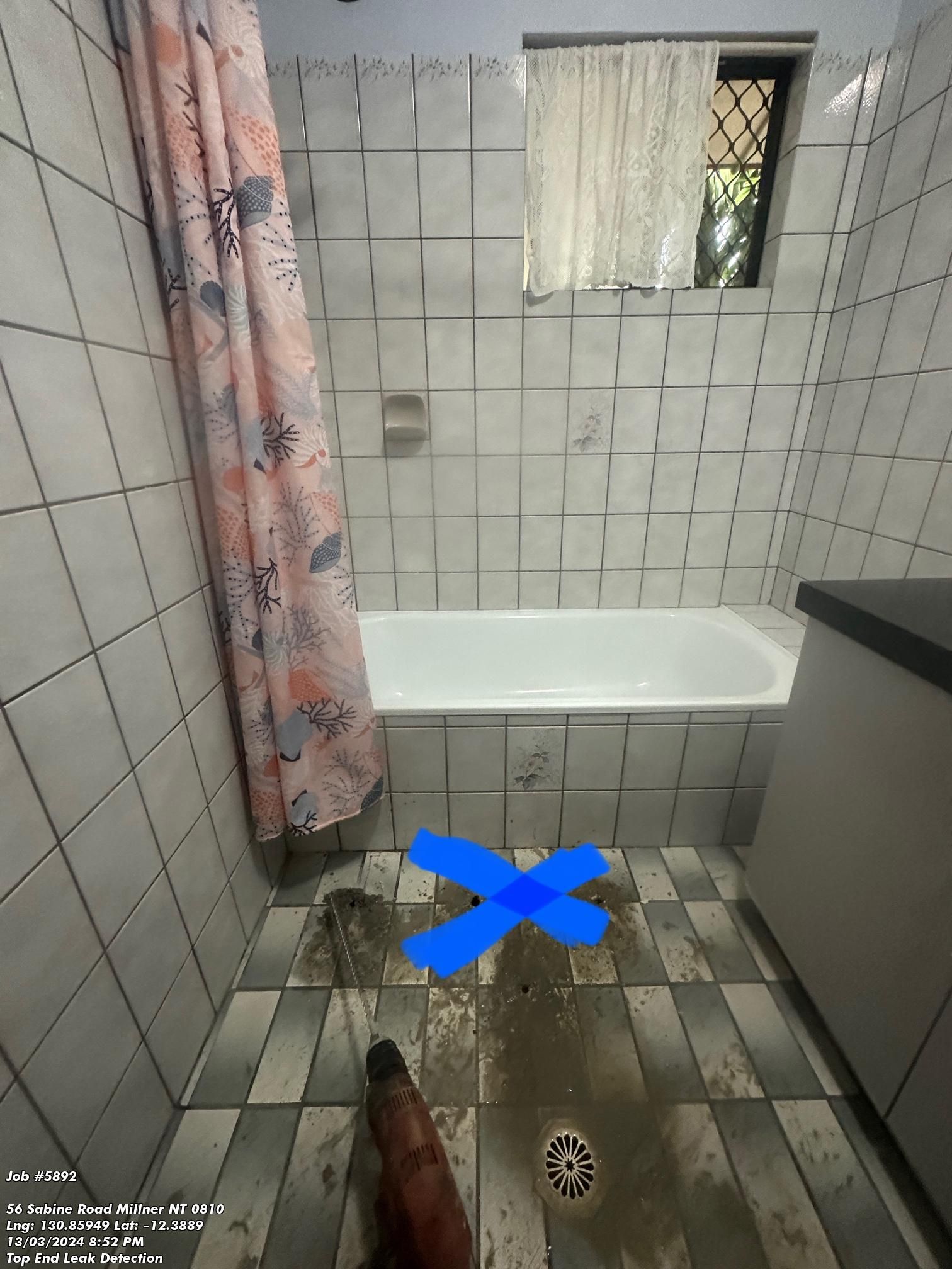 Leak detection experts attended and identified the leak in a bathroom under concrete, near the bath. Our team then attended the site and used cutting and jackhammering techniques to access the area identified by the leak detection. Upon exposing the 20mm copper line beneath the bath, it was necessary to remove the bath for proper access to the leak.