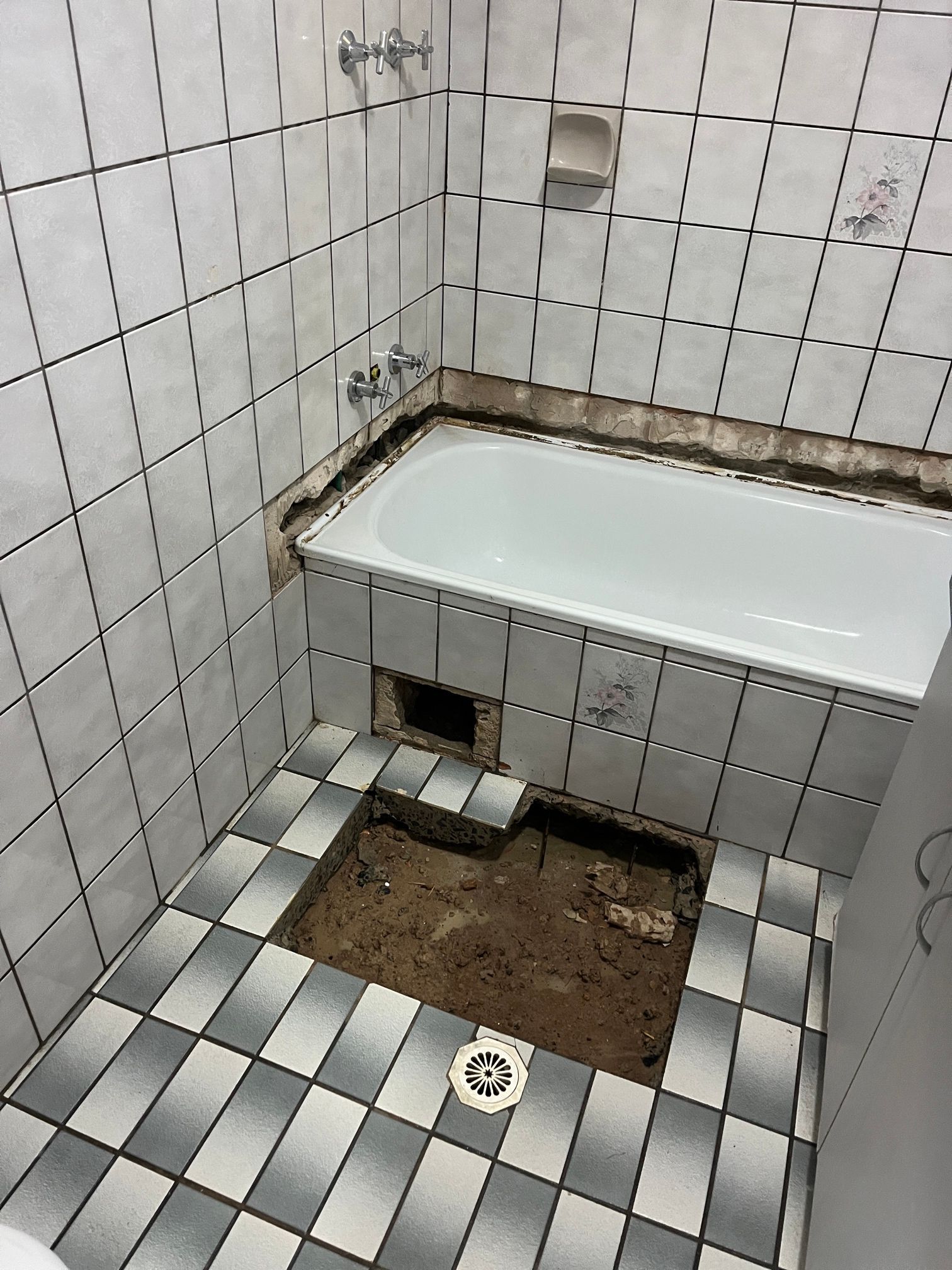 The leak was successfully repaired, and the bath was reinstalled, ready for tiling to restore the bathroom to its original state.